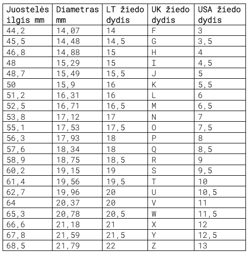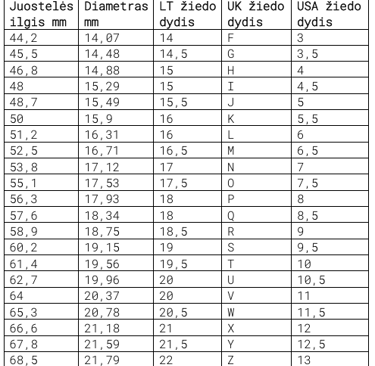 • Naudodamiesi pateikta lentele sužinosite jums tinkamo žiedo dydį.